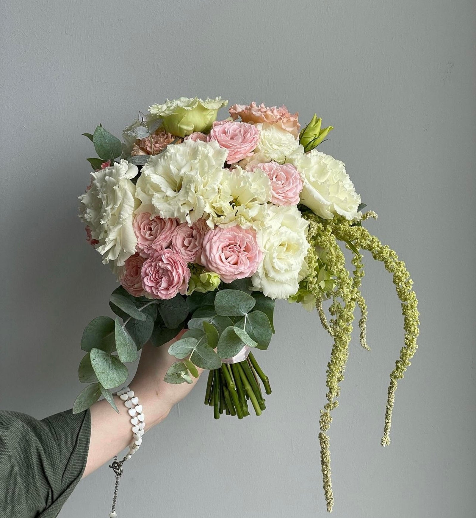 This stunning arrangement features a beautiful mix of soft pink and ivory flowers, creating a timeless and elegant look for your special day. Delicate roses, frilly carnations, and lush eucalyptus come together to form a bouquet that radiates grace and sophistication.